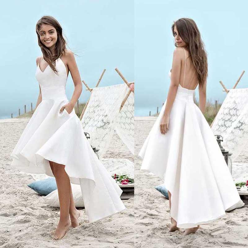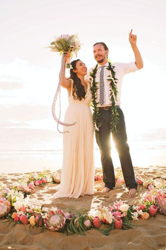 Lo tercero es la vestimenta para la ceremonia. Aquí lo mas cómodo serán vestidos de novia sin cola. Pueden ser cortos o hasta los tobillos, pero si arrastra, de que salgas de la arena, se te romperá y manchará y si es largo tampoco podrás hacerte la típica y bonita foto mojandote los pies con tu pareja. Hablando de los piés, la mejor opción es ir descalzos durante la ceremonia.